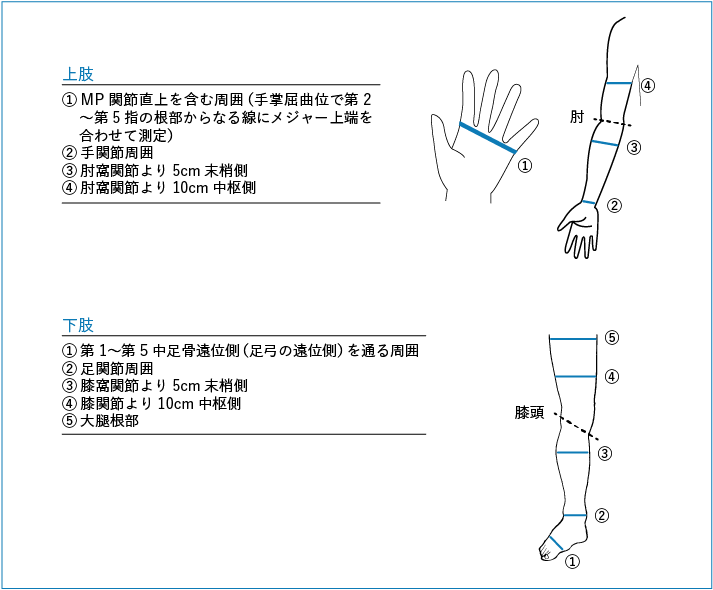 リンパ浮腫の初期症状にいち早く気付くために、むくみやすい場所の太さを測定しておくこともおすすめします。太さを正確に測るポイントは、以下のとおりです。