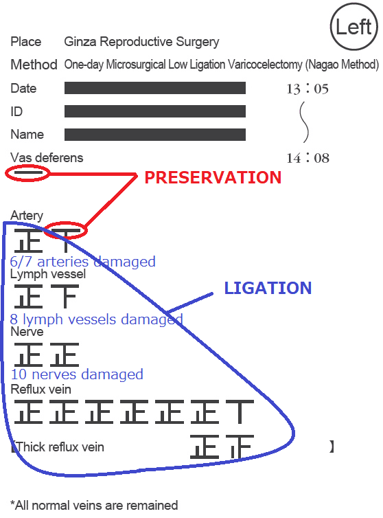 The Nagao method performed at this clinic checks the vas deferens, arteries, lymph vessels, nerves, and bad regurgitation veins one by one, and the most important arteries are checked with a Doppler blood flow meter, and the important ones are left. It is a technically advanced operation that leaves everything and ligates only the bad regurgitation veins. It stops all bad regurgitation veins and leaves everything important, so there is no blood flow obstruction or lymphedema. The risk of recurrence is also the lowest at 0.5%.