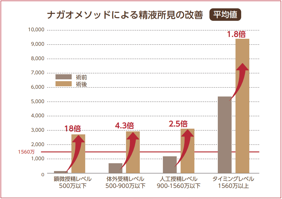 ナガオメソッドは必要なもの全てを残すので、一般的な手術に比べて機能の低下や合併症も殆どなく、精液所見の改善も87%(※1)と高い結果を得られています。