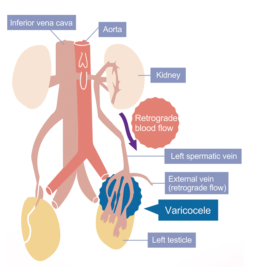 In addition, blood returns from the varicocele to the left renal vein, but in varicocele, a nut cracker phenomenon occurs in which the left renal vein is pressed against the abdominal aorta and superior mesenteric artery, resulting in poor blood return.