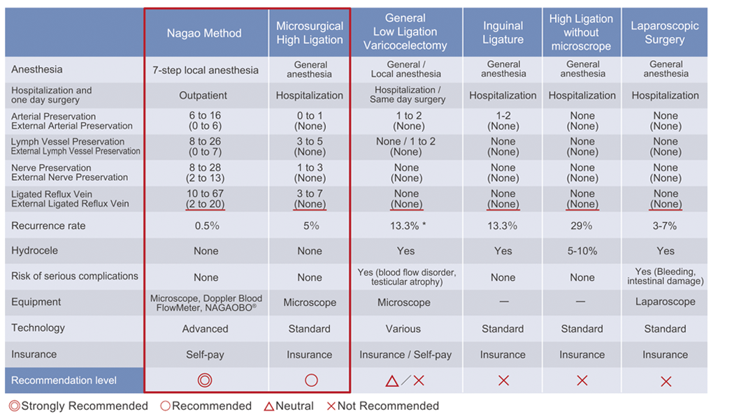 * In Japan, the recurrence rate is the same as that of inguinal ligation because the external varicocele is left.